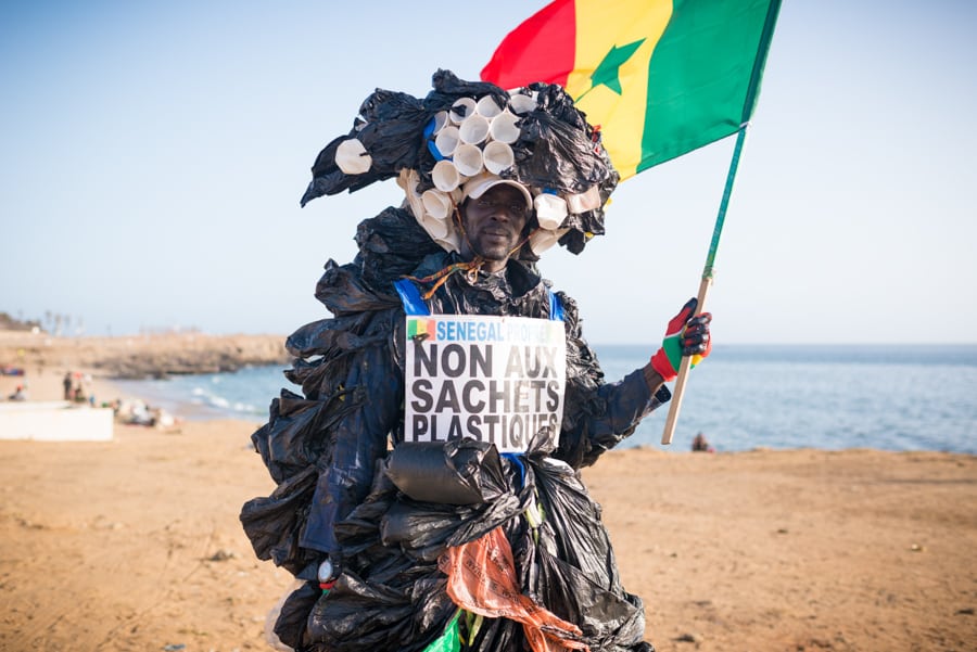 Modou Fall, Aktivist aus dem Senegal, hat sich am „World Oceans Day“ kunstvoll mit Produkten aus Plastik verkleidet und fordert eine Welt ohne Plastik (sein Schild: non aux sachets plastiques). Am Strand „Parcours Sportif“ in Senegal versammelten sich nicht nur Greenpeace AktivistInnen, auch Fischer und Liebhaber des Meeres kamen, um gemeinsam die Bedeutung der Meere zu feiern. Mit einem einstudierten Flashmob zeigten Betroffene unsere Abhängigkeit von sauberen und gesunden Weltmeeren.
