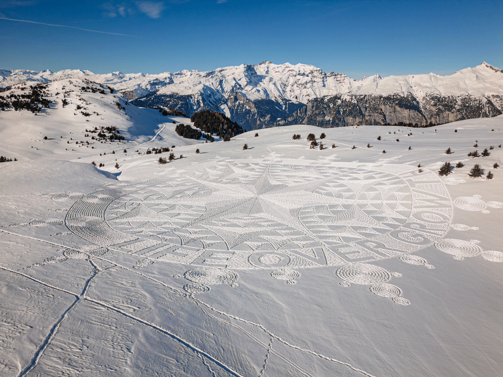 Dort haben, akkurat in die Landschaft eingebettet, der britische Schneekünstler Simon Beck und sieben Greenpeace-Aktivist:innen rund 12 Stunden lang auf einer Fläche in der Grösse von über zwei Fussballfeldern ein Bild in den Schnee gestampft. Die geometrischen Muster symbolisieren die Schönheit unseres Planeten, auf dem alles Leben miteinander verwoben ist.