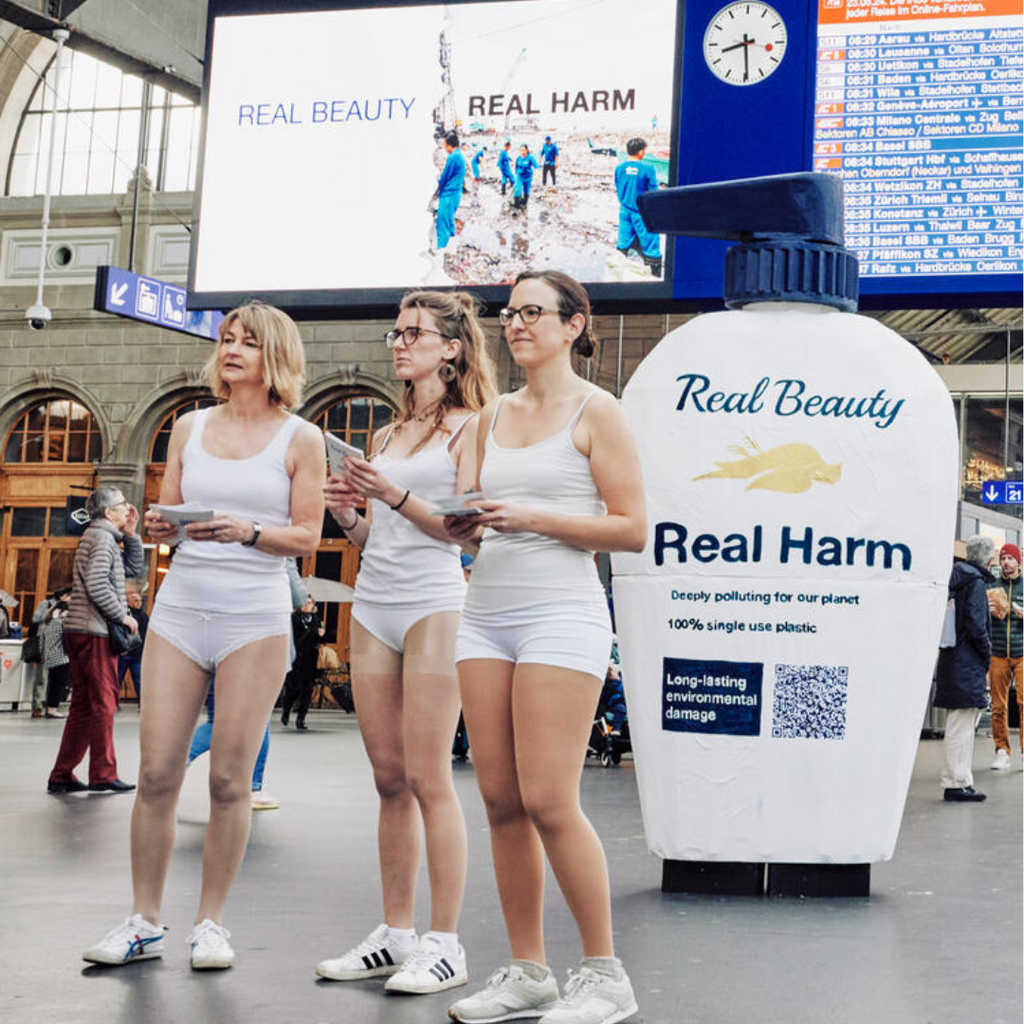 Greenpeace-Aktivist:innen machten am 26. März 2024 am Zürcher Hauptbahnhof darauf aufmerksam, dass Dove unseren Planeten mit Plastik vergiftet. In ihren «Real Beauty»-Kampagnen behauptet Dove, ihr lägen Frauen am Herzen. In Wahrheit heizt Dove eine Umweltkatastrophe im Globalen Süden an, von der benachteiligte Frauen stark betroffen sind.