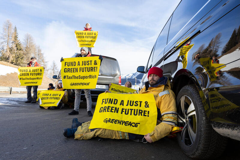 Greenpeace-Aktivist:innen aus verschiedenen Ländern Europas haben die Zufahrt beim Heliport Lago in Davos blockiert. In Davos versammeln sich derzeit am World Economic Forum (WEF) CEOs und Politiker:innen aus der ganzen Welt. Die Aktivist:innen fordern eine faire Besteuerung von Superreichen für den Umweltschutz und eine gerechte Zukunft für alle.