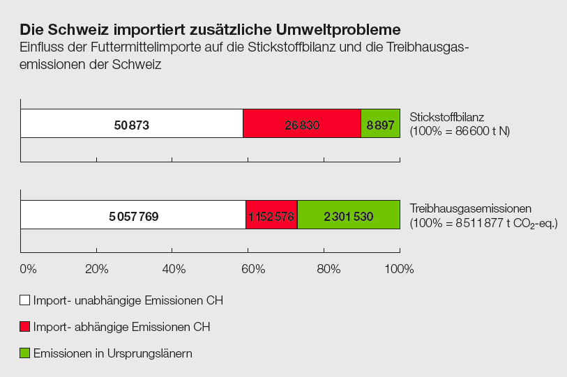Eine Hauptquelle der Gewässerverschmutzung in der Schweiz ist der Stickstoff. Dieser wird durch Gülle freigesetzt, welche auf den Feldern ausgebracht wird. So produziert die Schweizer Landwirtschaft jedes Jahr fast 100’000 Tonnen an Stickstoffüberschüssen. Ein Viertel davon ist auf Futtermittelimporte zurückzuführen. Stickstoffverbindungen führen zur Überdüngung von Böden und Gewässern und tragen zur globalen Erwärmung bei. Dadurch sind Futtermittelimporte sowohl in der Schweiz als auch in den Erzeugerländern eine Quelle von Treibhausgasemissionen.