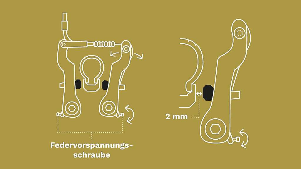 - Bei V-Brakes kannst du mit Drehen an der Federvorspannungsschraube die Bremsarme einmitten.