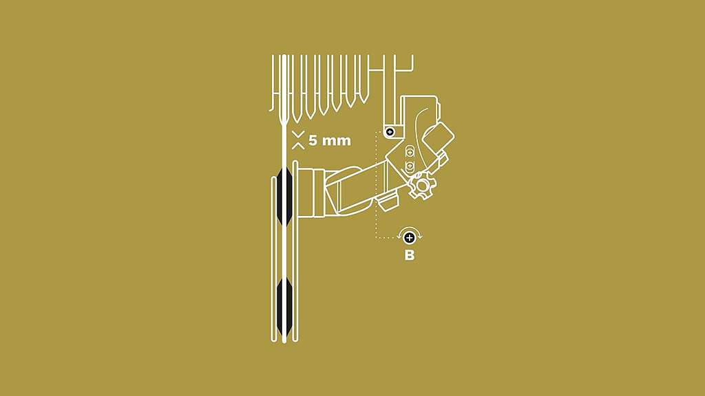 Schalte auf das grösste Ritzel der Kassette. Die Umschlingung sollte so eingestellt sein, dass zwischen Leitrollen und Ritzel ca. 5-6 mm Platz ist. Durch Drehen der Einstellschraube (B) bewegst du das Schaltwerk nach oben oder unten.
