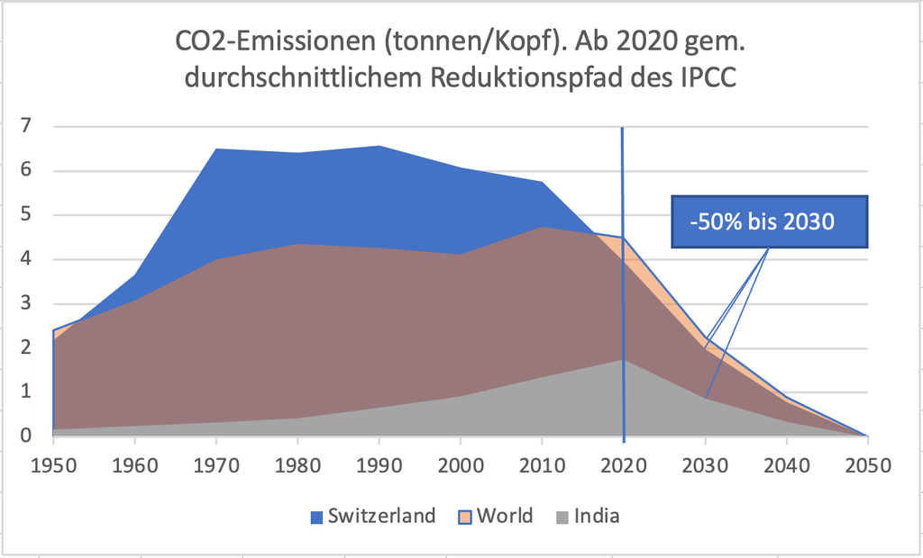 Die folgende Grafik veranschaulicht diese Übervorteilung. Sie zeigt die vergangenen und zukünftigen Pro-Kopf-Emissionen gemäss dem von der Schweiz verfolgten Ansatz. Dieser führt dazu, dass in Zukunft hierzulande weiterhin mehr Emissionen verursacht werden als z.B. in Indien. Und noch etwas fällt auf: der Ansatz blendet jegliche Verantwortung aufgrund der schon erfolgten Emissionen aus. Ganz entsprechend der Logik: wer schon viel verbraucht und hohe Emissionen hat, dem soll auch künftig mehr gegeben werden. Was soll daran gerecht und fair sein, dass eine Person hierzulande mehr als das Doppelte des globalen Budgets beansprucht als eine Person in Indien oder in hunderten anderen Ländern?