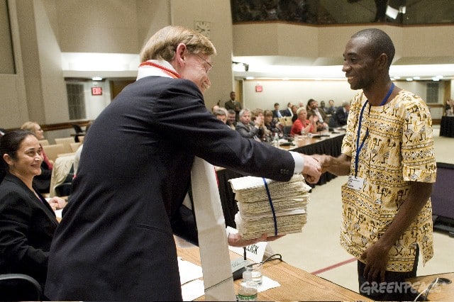Eine Delegation kamerunscher und kongolesischer Jugendlicher überreichte letzte Woche 42’000 gesammelte Unterschriften gegen den Raubbau im afrikanischen Regenwald an Weltbank-Präsident Robert Zoellick. Jean-Christian Ebanda aus Kamerun übergibt die Petition mit…