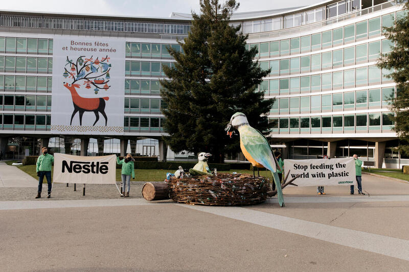 En tant que consommatrices/-eurs, nous pouvons être efficaces contre les déchets plastiques, mais les groupes multinationaux comme Nestlé jouent un rôle au moins aussi important. Ils produisent d’importantes quantités de plastique jetable et inondent ainsi la Terre de déchets. Chaque année lors du Clean-up Day, nous identifions les pires pollueurs de la planète au moyen du Brand Audit. Et Nestlé fait régulièrement partie du Top 3. C’est pour cela que nous lui avons aussi rendu visite cette année à Vevey avec un invité surprise. Cinq militant-e-s ont déposé un énorme nid d’oiseau devant l’entrée du siège international. Des emballages Nestlé à usage unique y étaient entremêlés. Nous appelons ainsi le groupe multinational à renoncer à la culture du prêt à jeter et à miser sur des solutions à plusieurs usages. C’est aussi ce que dit la banderole : « Nestlé cesse de nourrir le monde avec du plastique ! »