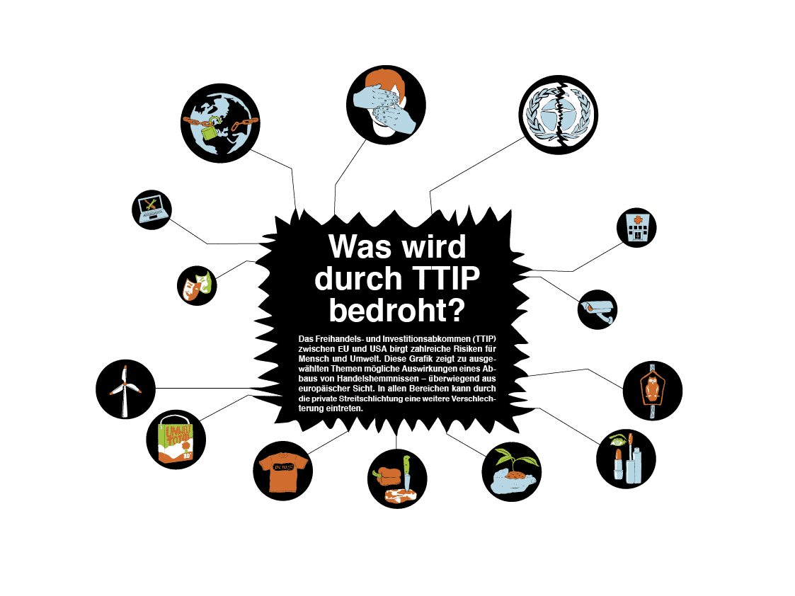 Die Freihandelsabkommen TTIP (Transatlantic Trade and Investment Partnership) zwischen den USA und der EU und TiSA (Trade in Services Agreement) zwischen 50 Staaten schaffen riesige globale Freihandelszonen. Die Verhandlungen zum Abschluss der Abkommen laufen unter Ausschluss der Öffentlichkeit. Doch nun ist brisantes durchgesickert: Die Interessen von Unternehmen werden über den Schutz der Menschen und der Umwelt…