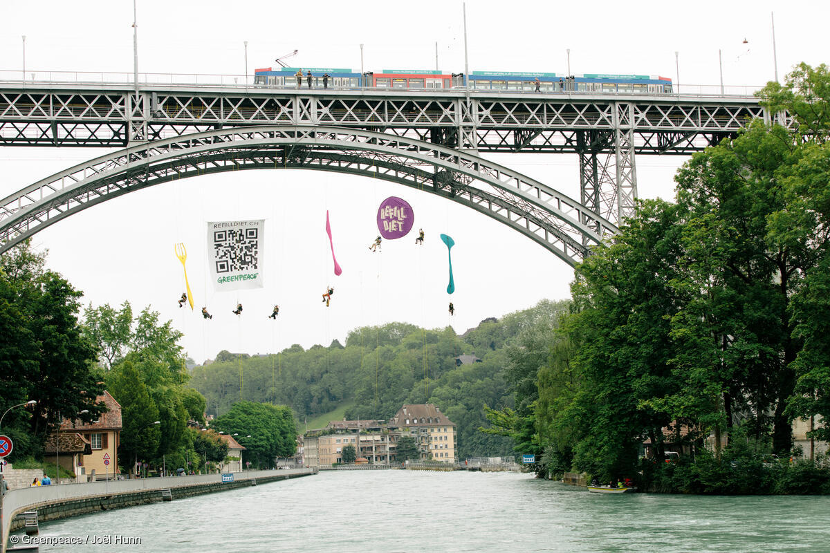 Rund 15 Greenpeace-Aktivist*innen liessen am Samstag in Bern – zur Verdeutlichung der Bedeutung von Mehrweggeschirr für die Umwelt – über sechs Meter langes, farbiges Besteck und Teller von der Kirchenfeldbrücke hängen.