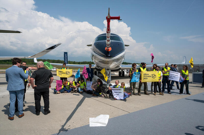 Verkaufsmesse für Luxusflugzeuge in Genf: Klimaaktivist:innen blockieren Privatjets