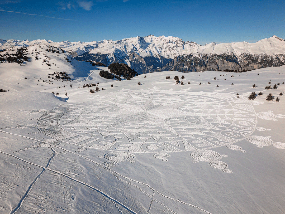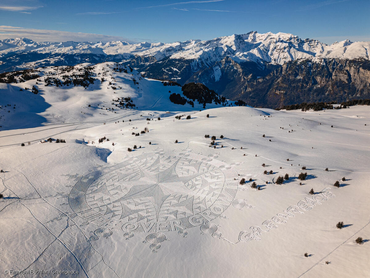 In Davos findet das 54. Weltwirtschaftsforum statt. Zusammen mit dem britischen Schneekünstler Simon Beck hat Greenpeace als Zeichen gegen den Wachstumsfokus ein riesiges Schneebild in die Bündner Berglandschaft gestampft.