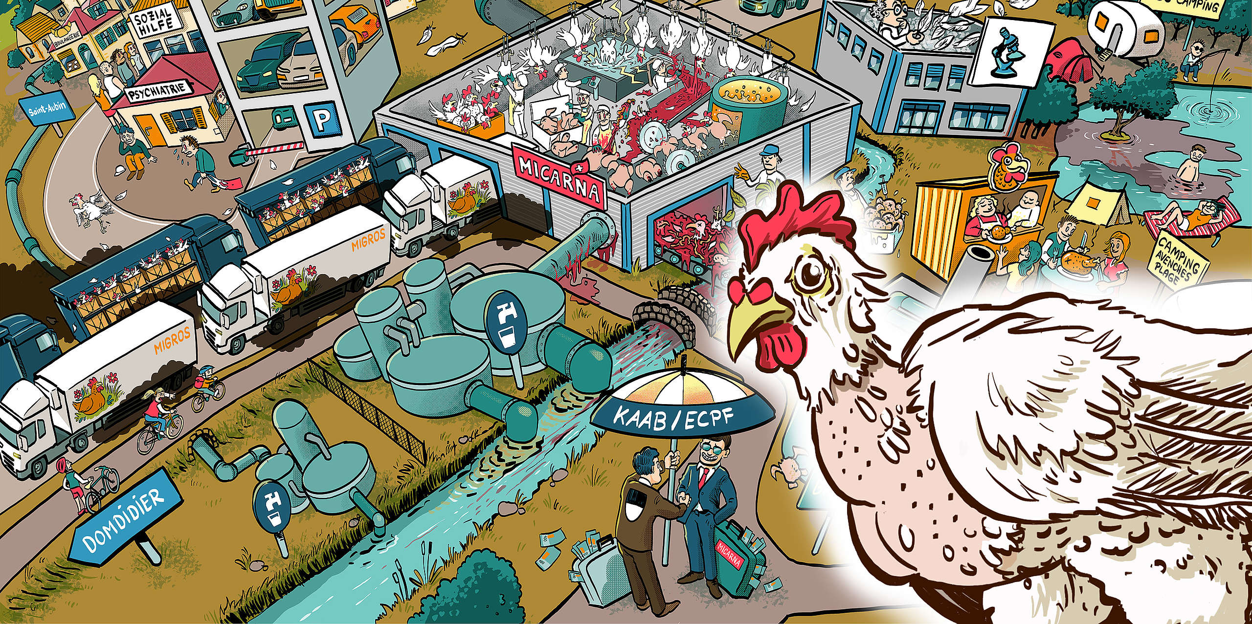 Micarna, ein Tochterunternehmen der Migros-Gruppe will in St-Aubin im Kanton Freiburg einen riesigen Geflügelschlachthof bauen. Die Migros-Gruppe will den Geflügelschlachthof auf dem AgriCo-Gelände bauen.