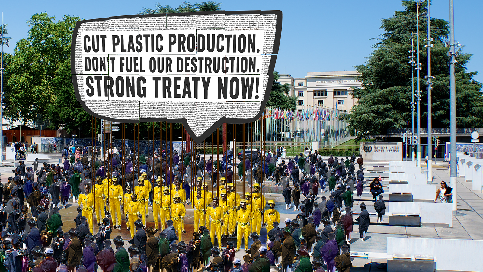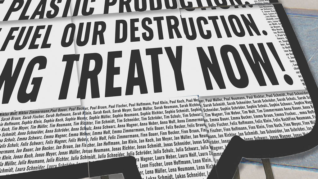 Mit deinem Namen auf unserer Sprechblase wirst du Teil unserer Botschaft an die Regierungen: «Cut plastic production. Don’t fuel our destruction. Strong treaty now!» («Reduziert die Plastikproduktion. Stoppt die Zerstörung unseres Planeten. Ein starkes Plastikabkommen – jetzt!»)