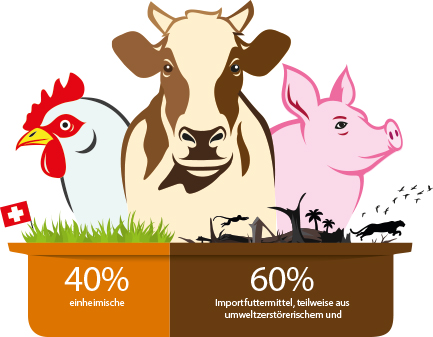 - Futtermittelimporte stoppen: Heute werden 60 Prozent des Kraftfutters für Schweizer Nutztiere aus dem Ausland, zum Beispiel aus Brasilien, importiert. Greenpeace fordert vom Bundesrat eine rasche Reduktion und mittelfristig den völligen Verzicht auf umweltzerstörende Futtermittel- und Fleischimporte.