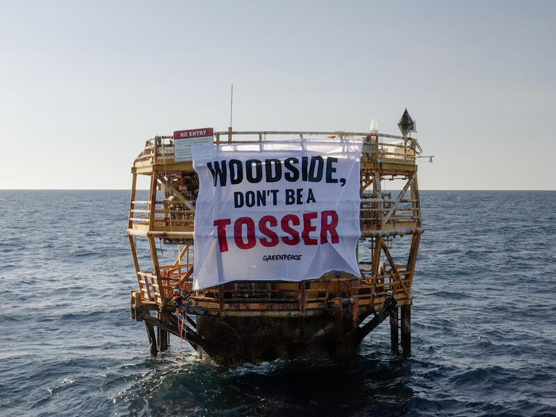 David: Im Mai haben Aktivist:innen eine verlassene Ölplattform besetzt. Sie rottet draussen im Meer vor sich hin, 83 Meter lang und 2500 Tonnen schwer. Woodside hätte die Plattform auf Geheiss der Behörden an Land bringen sollen. Passiert ist nichts. Wir haben die Plattform besetzt und ein Banner gehisst: «Woodside, don’t be a tosser». «Tosser» ist ein derbes Slangwort für jemanden, der Müll wegwirft. Es bedeutet aber auch Trottel, Idiot.