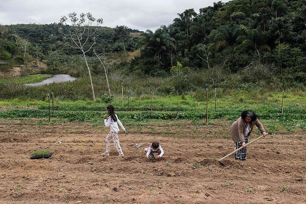 23 Hektar Land besitzen Sirley Gil und ihr Mann. Auf weiteren abgelegenen Parzellen pflanzen sie Bananen, Limonen, Bohnen, Süßkartoffeln und Maniok. Die Gils zählen zu Brasiliens mehr als fünf Millionen Kleinbauern und -bäuerinnen, die im Gegensatz zur mächtigen Agrarindustrie, die mit ihren gigantischen Flächen vor allem für den Export produziert, Lebensmittel für die Brasilianer:innen anbauen.