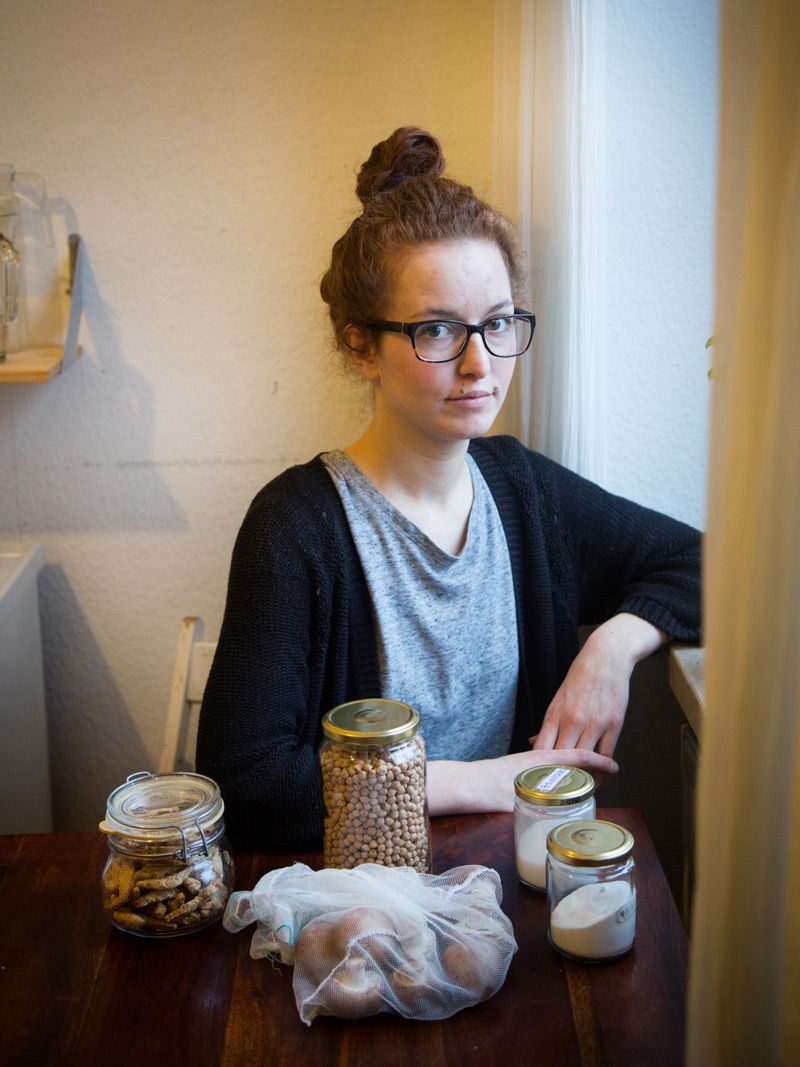 Aber was ist mit dem Essen? Wie verpflegt man sich, ohne Abfall zu produzieren – vor allem wenn man so viel unterwegs ist wie viele aus Lisas Generation? Ich denke an den Zug um 7 Uhr morgens von Basel nach Zürich, wo man die Pendler ohne «Coffee to go» an einer Hand abzählen kann, an die Abfallkübel, die sich innert Minuten mit Kartonbechern füllen. Lisa trinkt ihren Kaffee am Morgen zuhause und sonst nur aus Tassen. Fürs Mittagessen füllt sie Bratkartoffeln vom Vorabend in ihren gläsernen Thermopot oder nimmt ein Stück selbstgebackenes Brot mit. An der Uni holt sie sich für weniger als einen Euro Salat dazu. Sie war schon als Kind Vegetarierin, seit drei Jahren isst sie «zu 95 Prozent vegan, das macht es bedeutend einfacher, keinen Müll zu produzieren». Doch ist das nicht alles wahnsinnig anstrengend, spassbremsig und genussfeindlich? «Nein», ist Lisa überzeugt. Auf Make-up zum Beispiel will sie nicht verzichten. Sie zehrt von ihren alten Beständen, eine unverpackte Alternative hat sie noch nicht gefunden. Doch sie ist guter Dinge; ihre Blogleser versorgen sie mit wertvollen Tipps. Sie sagt: «Ich will den Leuten zeigen, dass man nicht wie ein Hippie rumlaufen muss, nur weil man keinen Müll mehr produzieren will.»