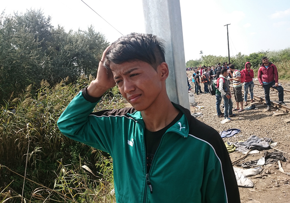 Wir gehen den Bahngleisen entlang zur Grenze und informieren die Menschen, dass sie von der Polizei im Camp nichts zu befürchten haben. Diese beaufsichtigt nur das Einsteigen in die Busse zum Bahnhof, wo Züge direkt zur österreichischen Grenze fahren. Drei junge, asiatisch aussehende Männer fragen, wie viel die Fahrt kostet. Kaum hören sie, es sei umsonst, rennen sie jubelnd los, um sich einen Platz zu ergattern.