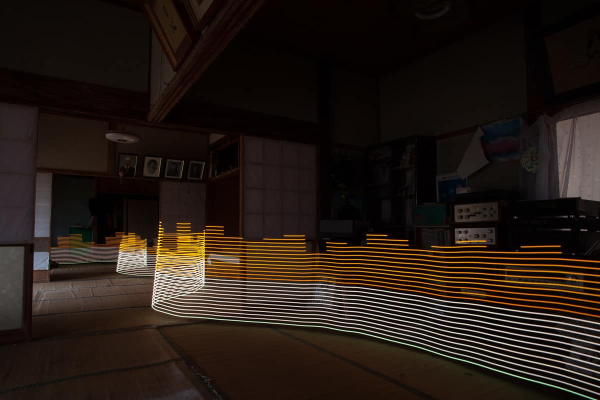 Wir fanden die Antwort in einem speziell angefertigten LED-Leuchtstab, der an einen Geiger-Zähler angeschlossen werden, das radioaktive Strahlungslevel messen und in Echtzeit anzeigen kann. Nimm ein Bild von einer kontaminierten Fläche mit langer Beleuchtungszeit auf und gehe mit dem Messgerät darüber, und schließlich erhältst du eine wellenförmige Lichtwand, die die Strahlung in der Umgebung visuell auf einer Karte darstellt.