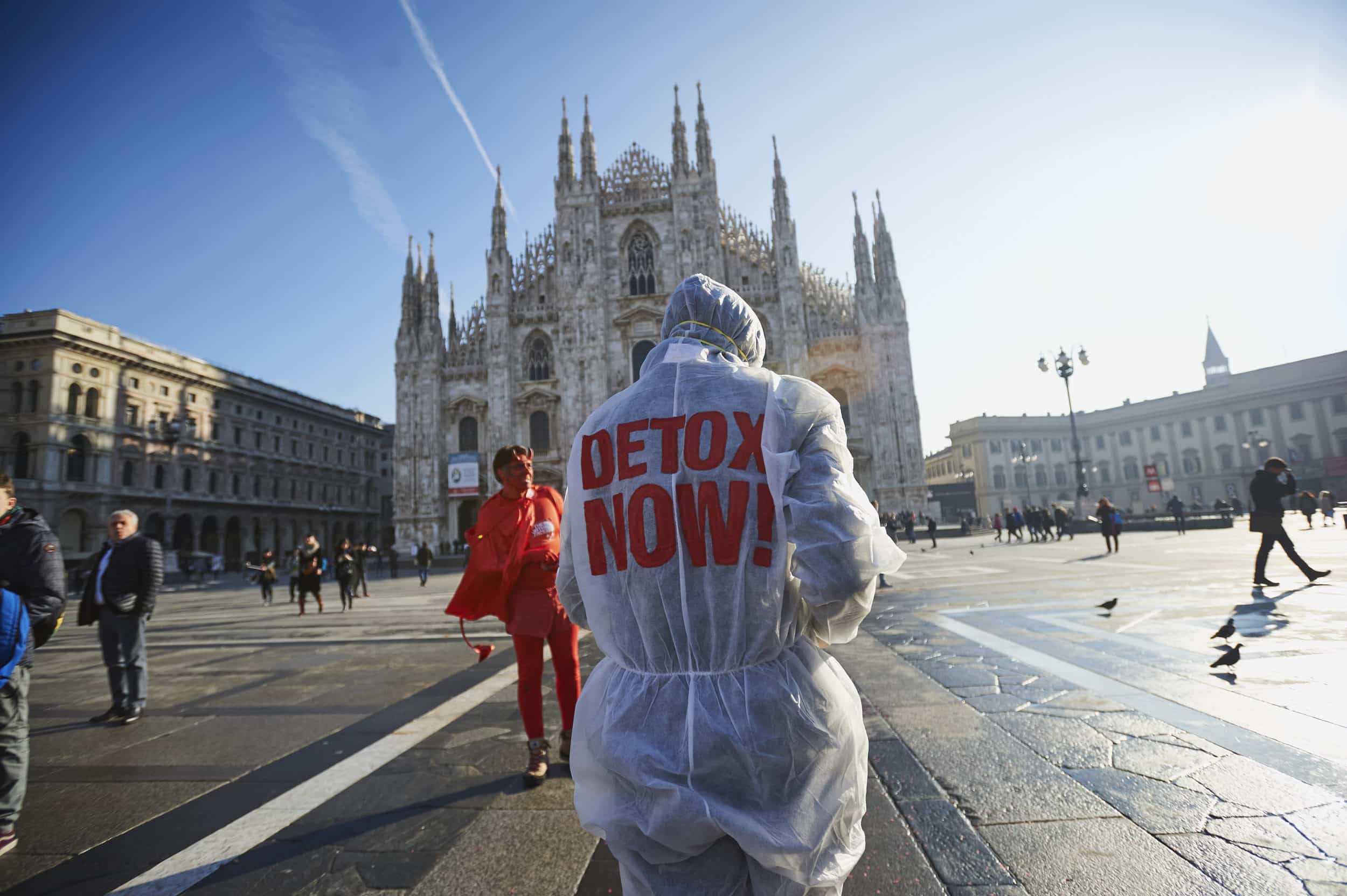 Mit bevorstehendem Frühling treten auch wieder alle möglichen Reinigungsaktionen und Entgiftungskuren auf den Plan. Dort setzt Greenpeace an: Mammut, North Face und Haglöfs — sie alle brauchen eine ordentliche Detox-Kur, denn die Chemie stimmt hier schon lange nicht mehr. 2015 hat Greenpeace in verschiedenen Naturgebieten weltweit Rückstände von PFC-Chemikalien (polyfluorierte Chemikalien) gefunden. Im Bild: Greenpeace-Aktivist vor dem Dom in Mailand. ©Alessandro Vona / Greenpeace