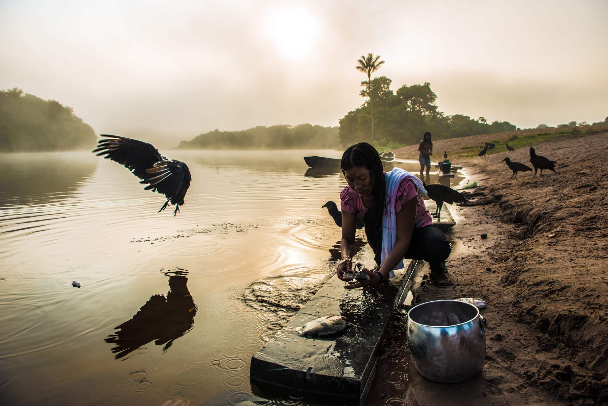 Ein Mega-Staudamm- Projekt im brasilianischen Amazonas bedroht die einzigartige Artenvielfalt und die Lebensgrundlage eines indigenen Volkes, der Munduruku. Dank dem Protest der Munduruku, der um die Welt ging, wird der Megastaudamm São-Luiz-do-Tapajós nun nicht gebaut. Der projektierte Mega-Damm des Tapajos-Flusses, einem der grössten Nebenflüsse des Amazonas, wäre über sieben Kilometer breit geworden und hätte eine Fläche so gross wie New York City überschwemmt. Im Bild: Eine Munduruku-Frau beim Fisch putzen am Fluss Cururu, einem Hauptzufluss des Tapajos-Flusses. ©Fàbio Nascimento / Greenpeace