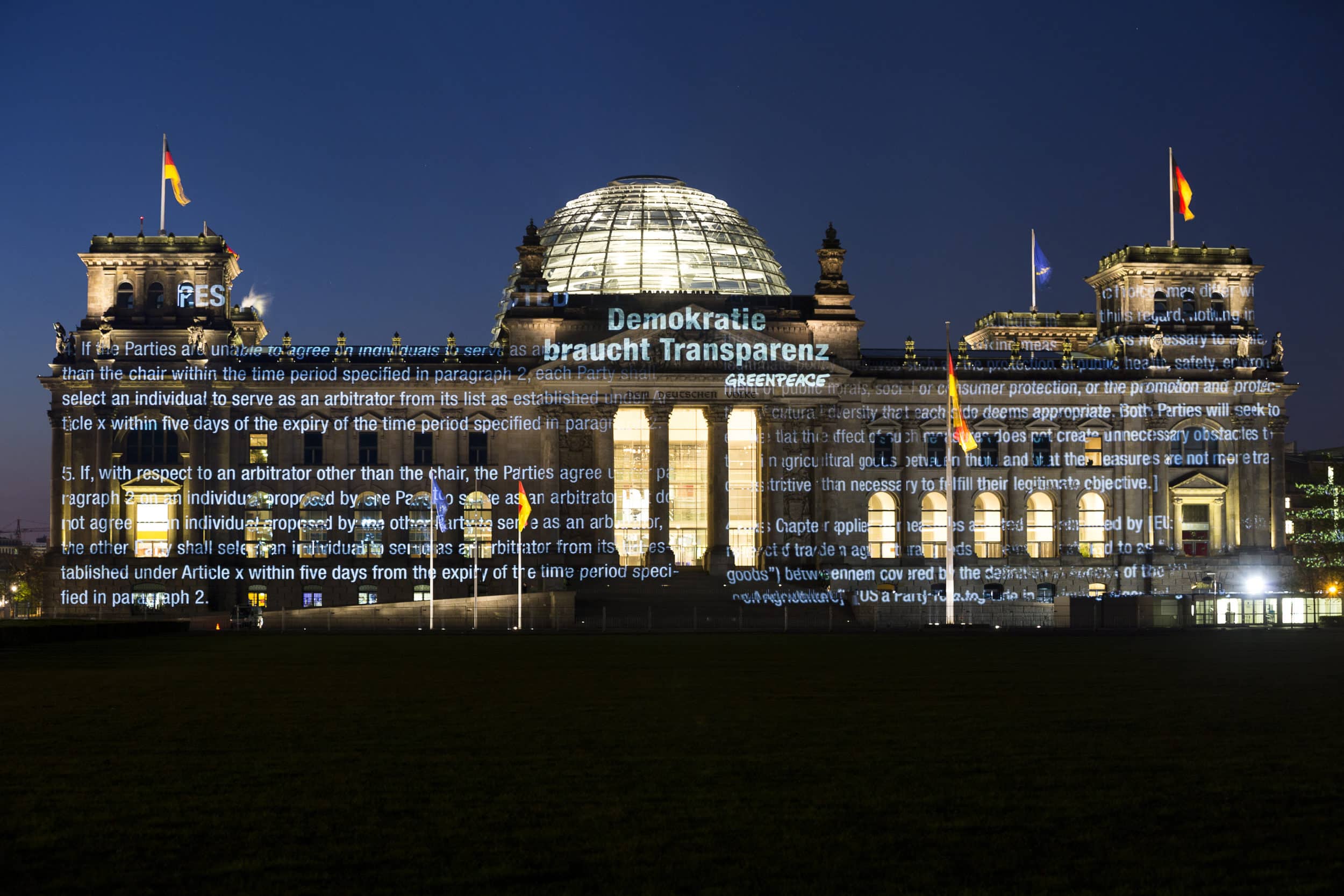 Der Monat begann mit einem Trommelwirbel: In der Nacht zum 2. Mai projizierte Greenpeace Niederlande bislang geheime TTIP-Dokumente an die Fassade des deutschen Bundestages. Seither sind die Dokumente für alle zugänglich. Damit hat Greenpeace Material veröffentlicht, das bis dato nur von ausgewählten Personen für maximal zwei Stunden unter Aufsicht gelesen wurden durfte – Kopien ausgeschlossen, dafür mit Schweigepflicht. Das Licht, in dem das deutsche Zentrum der Macht schliesslich erstrahlte, war wenig glanzvoll: Das Material offenbart, wie die TTIP-Verhandlungen das in Europa geltende Vorsorgeprinzip, das Produkte nur erlaubt, wenn sie für Mensch und Umwelt nachweislich unschädlich sind, durch das Risikoprinzip der USA aushebeln und allein in Europa das Leben von über einer halben Milliarde Menschen verändern werden. Solche Verhandlungen dürfen kein Geheimnis sein. Sie müssen öffentlich und transparent ausgehandelt werden. ©Daniel Müller / Greenpeace