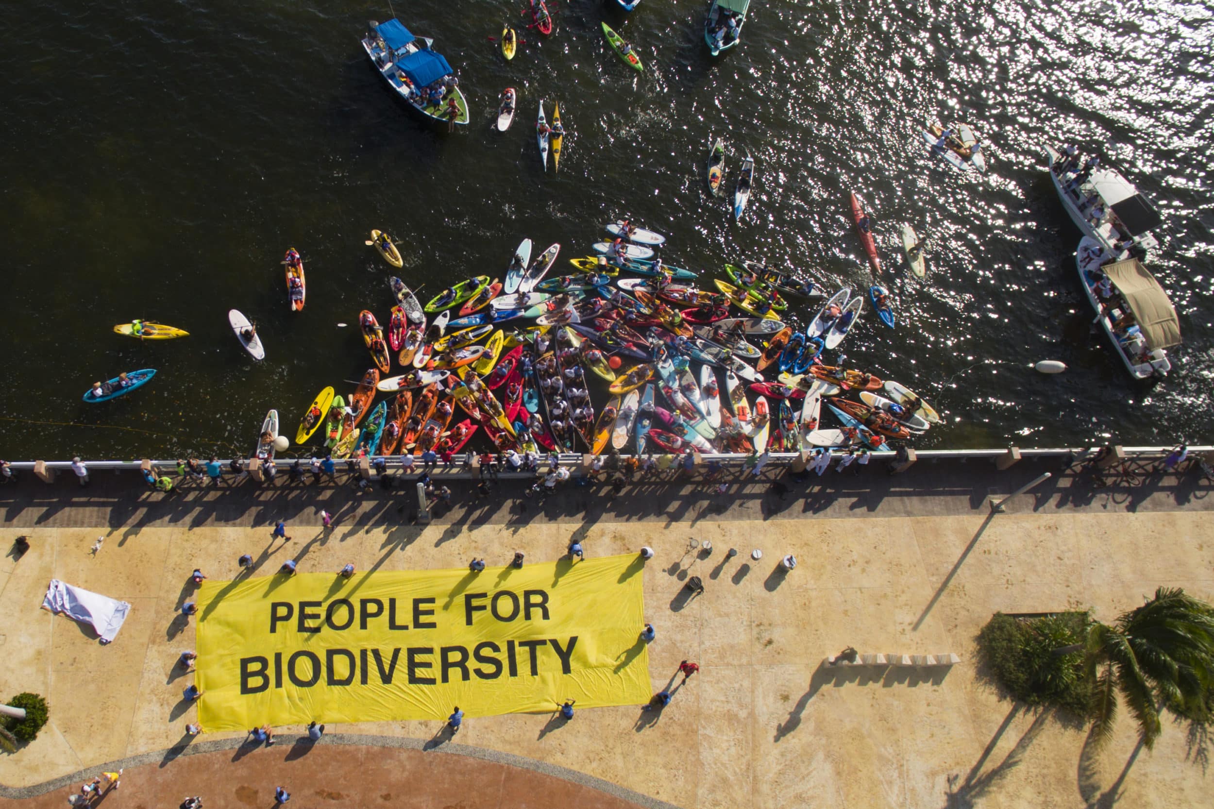 Mehr als 200 Menschen paddelten in Cancun (Mexiko) aufs Meer hinaus. Die Botschaft «Menschen für die Biodiversität». richtet sich an die führenden PolitikerInnen weltweit, die in Cancun an der Artenschutzkonferenz der UNO zusammenkommen. Sie sollen daran erinnert werden auch die Rechte der indigenen Bevölkerung anzuerkennen und zu respektieren. ©Greenpeace