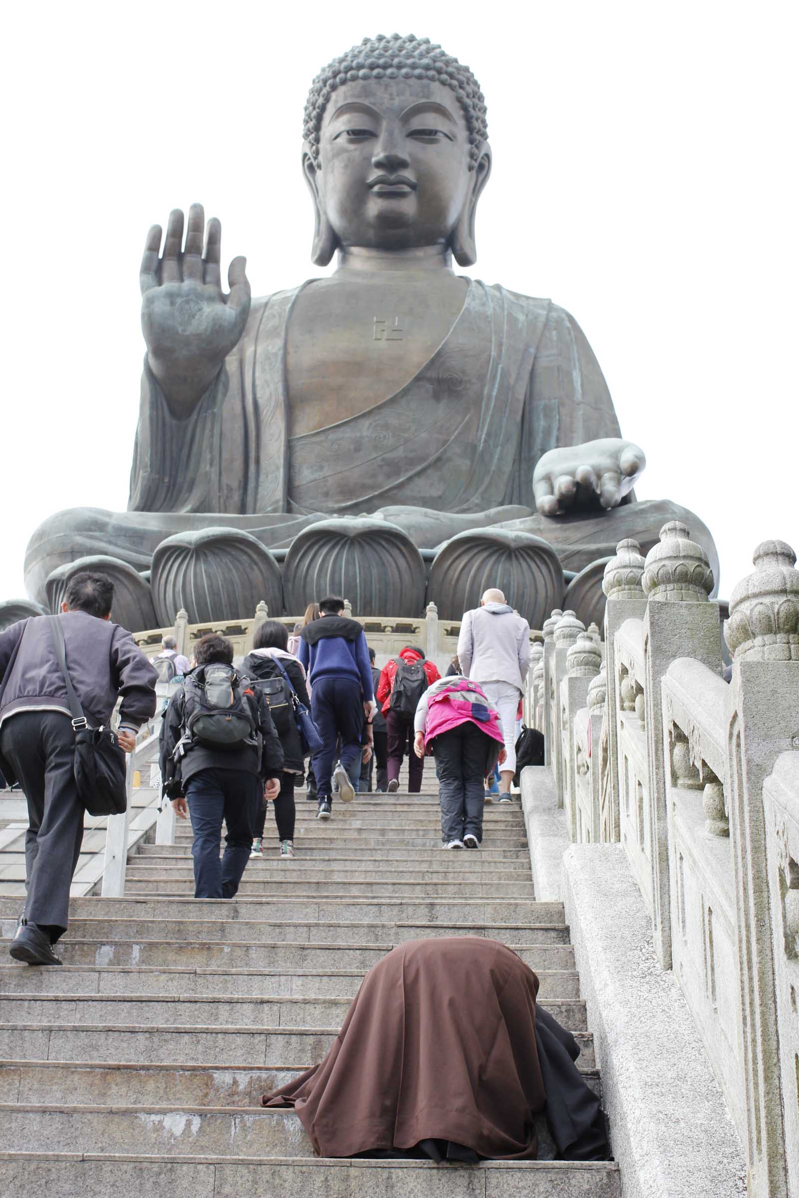 Plum Village Hong Kong ist ein Kind des Zen-Meisters und Friedensaktivisten Thich Nhat Hanh (Thay). Es ist eines von weltweit acht Klöstern, in denen Mönche und Nonnen sowie weltliche Anhänger «die Kunst des harmonischen Zusammenlebens untereinander und mit der Erde» lernen. Der 91-jährige Mönch gilt als Vater der Mindfulness-Bewegung und vehementer Verfechter eines «Engaged Buddhism», der die Nähe zum Menschen sucht und sich aktuellen Fragen stellen will. Meditation soll nicht nur in stillen, von Duftkerzen beleuchteten Seminarräumen stattfinden, sondern Teil des Alltags werden – beim achtsamen Sitzen, Gehen, Essen, Teetrinken und Gärtnern. Thay ist so etwas wie der Dalai Lama des Alltags. ❧ Am Tag des chinesischen Neujahrs, 2017 am 28. Januar, öffnet das Kloster jeweils seine Tore für Anhänger und Interessierte aus Hongkong und «Mainland-China». Rund zwanzig Besucher sind dieses Jahr gekommen, die meisten übernachten im Gästehaus mit seinen undichten Fenstern, den harten Betten und dem Gemeinschaftsbad. ❧ Für die Neujahrszeremonie begeben wir uns in den zentralen Tempel, der in einem weiten Garten mit Bambus und Bonsais liegt. Wir setzen uns auf die braunen Matten, die vor einer hohen, golden glänzenden Buddhastatue aufgereiht sind. Vor uns die Mönche und Nonnen im Lotussitz, in senfgelben Gewändern und mit kahl rasierten Schädeln. Einige tragen Kappen und Schals, denn in der Höhe von Lantau wird es im Januar nachts bitterkalt. ❧ Die Feier beginnt mit einer stillen Sitzmeditation. Nach einer halben Stunde leiten ein Gong und Trommeln zu Gesängen über. Im «Sutra of the insight that brings us to the other shore» geht es um Leiden, Weisheit und die Untrennbarkeit von Körper, Gefühl, Bewusstsein und allen Dingen im Kosmos.