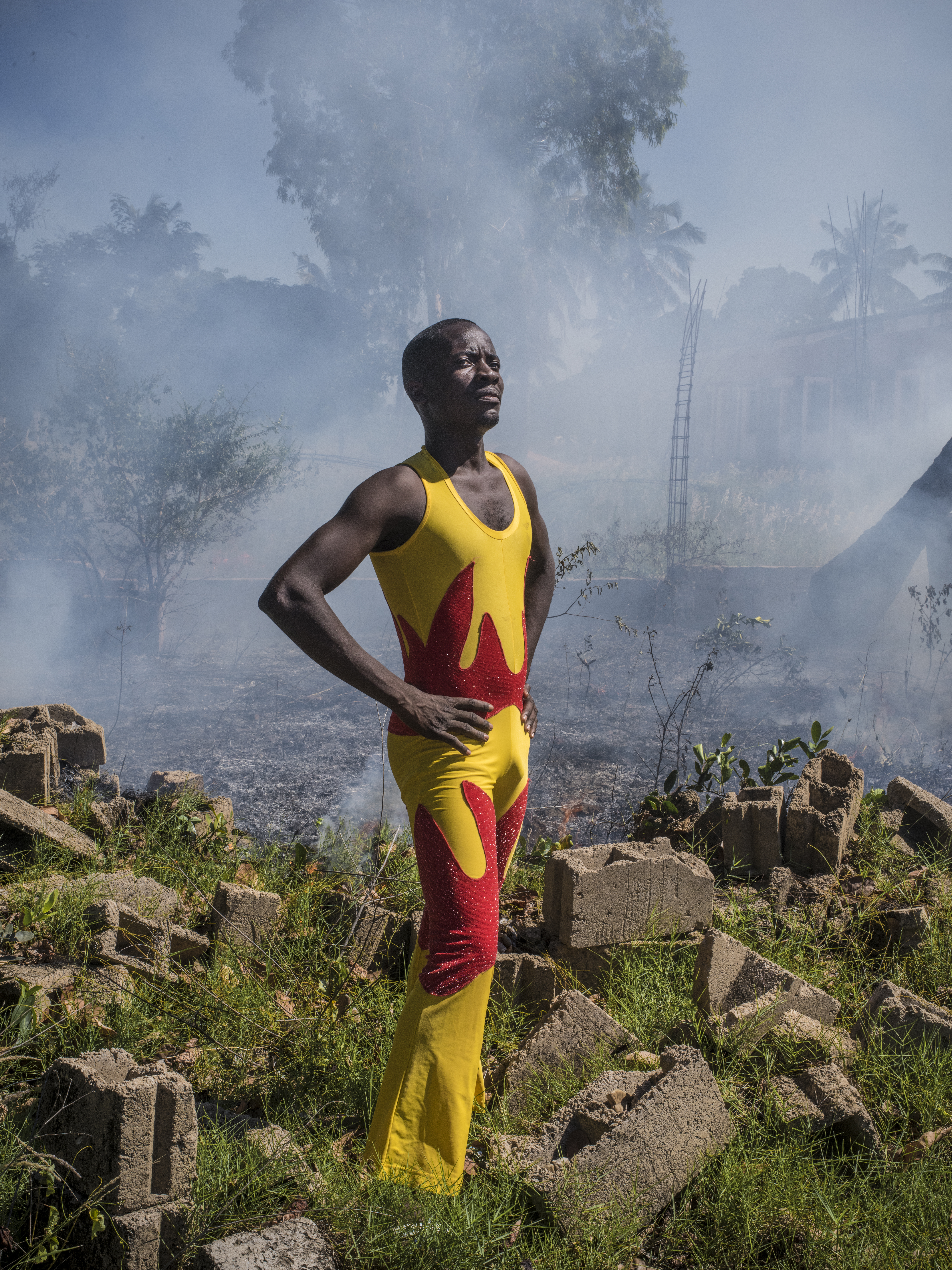 De Middels und Morais’ Projekt «Excessocenus» wurde im September 2016 von der Jury des Greenpeace Photo Award zur Umsetzung ausgewählt und mit 10’ 000 Euro gefördert. Die Idee: 40 Symbolbilder für Probleme zu schiessen, an denen unser Planet aktuell krankt. Umgesetzt in Mosambik, an der Südostküste des afrikanischen Kontinents; dort also, wo Regierungen und Menschen trotz katastrophaler ökologischer Begleiterscheinungen dem westlichen Wachstumsmodell nacheifern. Das Duo stellte Bilder nach, welche die Konsequenzen makroökonomischer Exzesse im Alltag der Menschen in Afrika greifbar machen. De Middel bleibt vor einer Tapete stehen, die einen grossen Mann in einem rot-gelben Superheldenkostüm zeigt. Er posiert vor einem Stück frisch verbrannter Erde, von dem noch Rauch aufsteigt – «On Man and Fire» lautet der Titel des Bildes. Es weckt Assoziationen an Brandrodungen für den Anbau von Palmöl oder Soja.