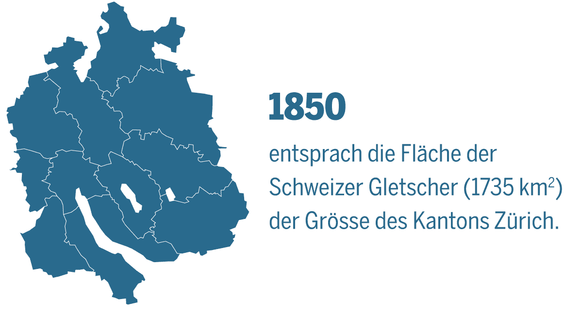 Die Schweizer Gletscher erreichten ihre grösste Ausdehnung während der kleinen Eiszeit um das Jahr 1850. Die gesamte Gletscherfläche betrug damals 1735 km² – exakt die Grösse des Kantons Zürich. Heute sind es nur noch 890 km². Innerhalb von 166 Jahren ist die Hälfte der Gletscherfläche der Schweiz geschmolzen.