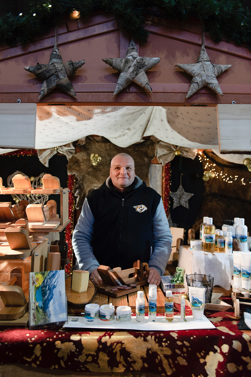 Beim Stand von Alpin Natürlich im Hauptbahnhof weiss man nicht so richtig, wohin man zuerst blicken soll: auf die gestapelten Käse- und Fleisch-Hobel links, den etwas stämmigen Verkäufer in der Mitte oder doch die Salben in verschiedenen Grössen und Formen auf der rechten Seite? Irgendwie passt alles nicht so richtig zusammen. Doch einen gemeinsamen Nenner haben sie: Sie sind durch und durch schweizerisch.