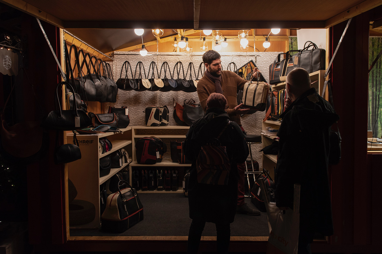 Auf den ersten und etwas entfernteren Blick sehen die Taschen am Stand von Patrick Zanini eigentlich ganz normal aus. Doch hält man sie in der Hand, fällt einem sogleich auf: Die sind aus einem ganz speziellen Material. «Reifen, Schlauch; Schlauch, Reifen – Schreif», erklärt der Geschäftsinhaber seine Produkte kurz und knapp. Was er damit meint: Taschen aus ehemaligen Lastwagen-Reifenschläuchen, die in einer Neun-Mann-Manufaktur in El Salvador hergestellt werden.