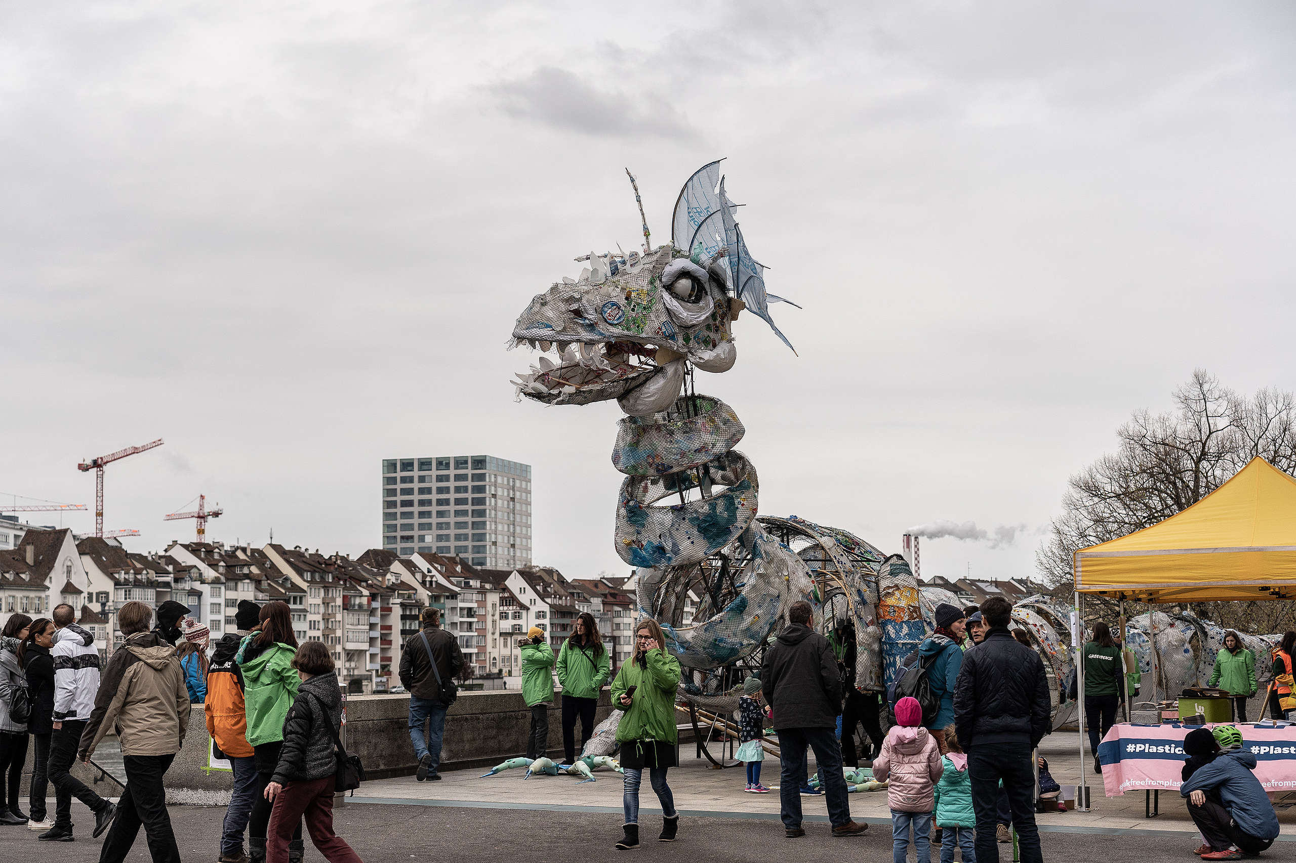 Kurz nach 8 Uhr an diesem ersten Sonntag im April hängen über der Stadt am Rhein schwere Wolken; es verspricht ein grauer und nasser Tag zu werden. Ganz anders als noch gestern. Da tummelten sich die Menschen bei sonnigem Wetter und angenehmen 17 Grad in der Stadt. Einer der Gründe, weshalb es viele Passantinnen und Passanten an den Infostand von Greenpeace Schweiz auf der Rheinterrasse verschlagen hatte. Vielmehr dürften aber die meisten sich dafür interessiert haben, wieso sich ein sieben Meter hohes Monster aus Verpackungsmüll am Rheinufer niedergelassen hat.