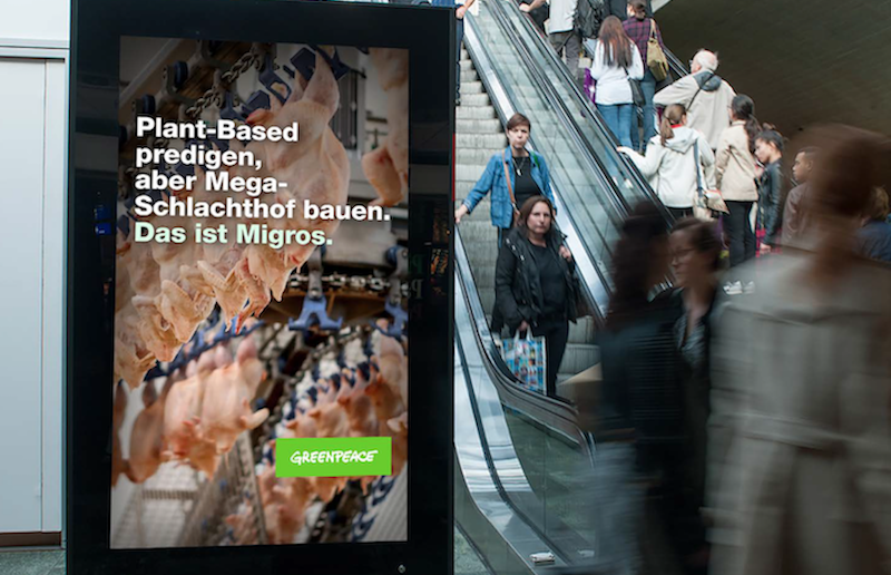 Eine der wirksamsten Massnahmen, um die Biodiversität zu erhalten und das Netto-Null-Ziel zu erreichen, wäre, weniger Tierprodukte anzubieten. Mit dem neuen, gigantischen Schlachthof plant die Migros jedoch, ihre nicht nachhaltige Produktion von Schweizer Fleisch weiter auszubauen, ohne den Import von Hühnerfleisch zu reduzieren oder zu stoppen.