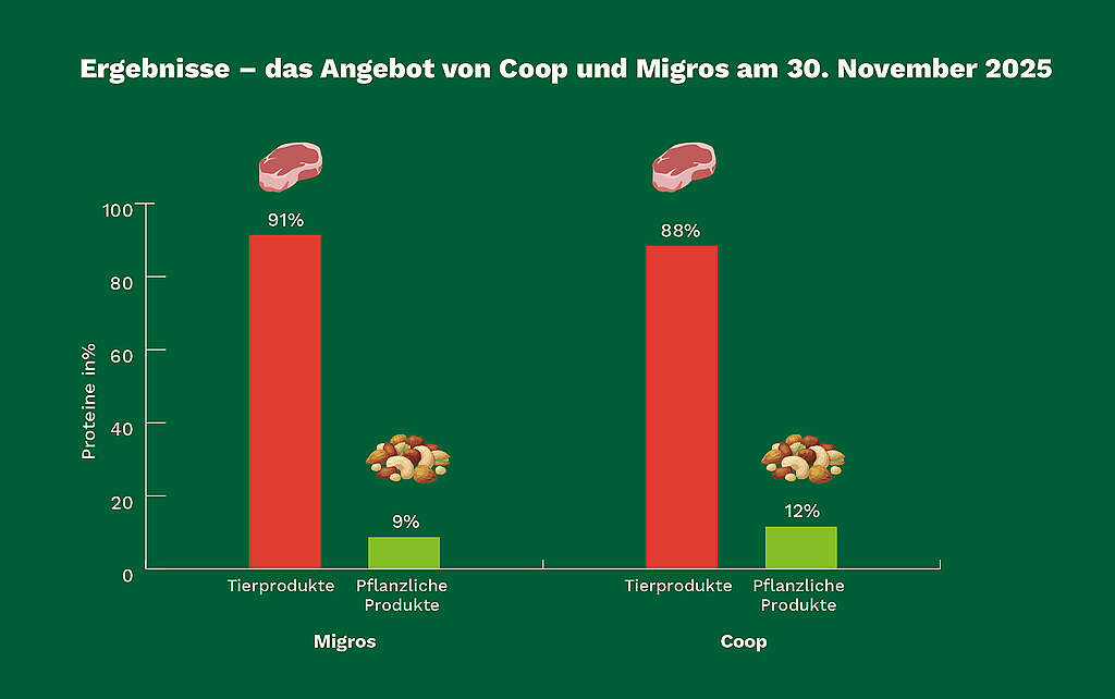Stichtag war der 30. November 2025. An diesem Tag boten beide Supermärkte in den ausgewählten Kategorien rund 2500 Lebensmittel an. Bei Migros waren 91 Prozent tierischen Ursprungs, bei Coop 88 Prozent. Diese Zahlen stimmen in etwa mit der Proteinverteilung überein, die Migros online ausweist. Ähnlich sieht es bei den Rabatten aus: 91 Prozent der Sonderangebote bei Migros betrafen Lebensmittel tierischen Ursprungs, bei Coop waren es 89 Prozent.