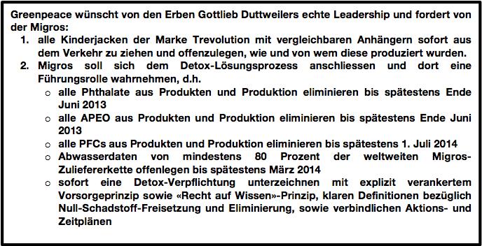 «Die Haltung der Migros ist umso bedenklicher, weil das Problem der Schadstoffe in der Branche hinlänglich bekannt ist.» hält Mirjam Kopp fest. Mit ihrer internationalen Detox-Kampagne hat Greenpeace in den letzten Monaten zahlreiche Firmen dazu bewegt, die Entgiftung der Textilindustrie und ihrer globalen Zuliefererkette anzugehen. Bis anhin haben 17 Unternehmen – darunter führende Textilmarken- und Detailhändler wie Zara, H&M, C&A, Marks & Spencer und Coop – sich dazu verpflichtet, auf eine giftfreie Produktion umzustellen. Zusammen decken sie US$ 168 Milliarden oder 13 Prozent des globalen Textil-, Bekleidungs- und Schuhwarenmarktes ab.