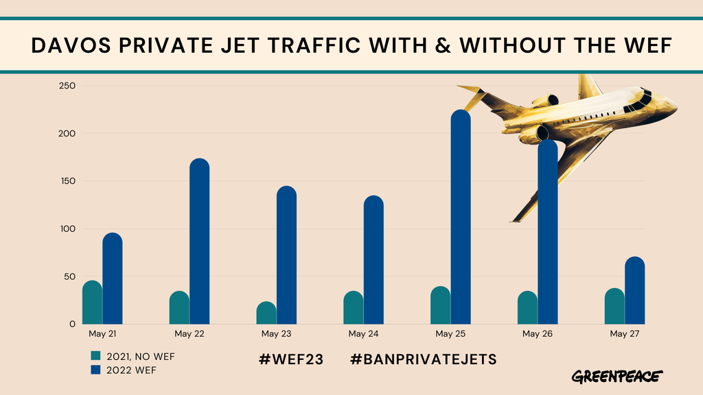 Eine von Greenpeace International in Auftrag gegebene Studie zeigt: Im Vergleich zum üblichen Verkehrsaufkommen waren während des Weltwirtschaftsforums (WEF) 2022 doppelt so viele Privatjets unterwegs. Sie verursachten viermal mehr CO2-Emissionen als üblich.