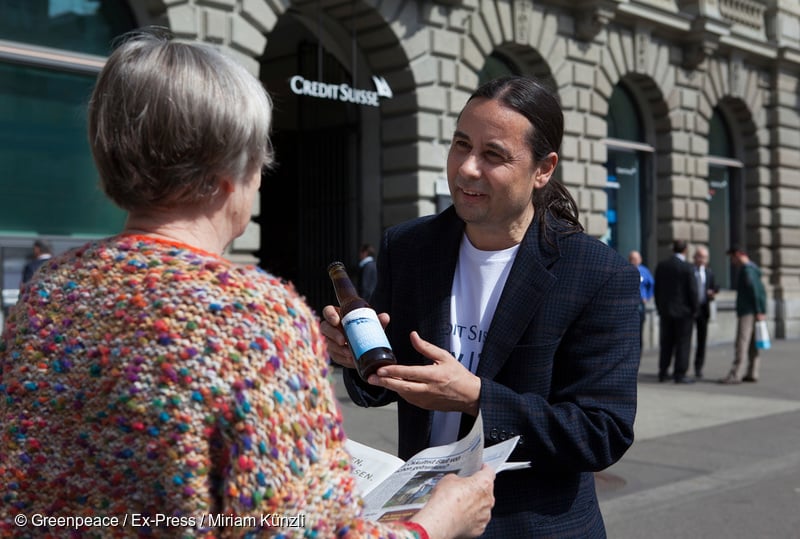 Rund 20 Greenpeace-Aktivistinnen und -Aktivisten haben heute über Mittag in Zürich, Bern und Basel vor Filialen der Credit Suisse Fläschchen verteilt mit der Aufschrift «Pure Dakota Spring Water». In den Fläschchen befindet sich ölig-dreckiges Wasser. Die AktivistInnen machten Passanten und CS-KundInnen so auf die dreckigen Pipeline-Deals der Schweizer Grossbank aufmerksam: Die Dakota Access Öl-Pipeline droht…