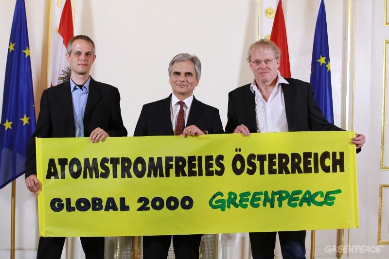 Zoom © Greenpeace/Georg Mayer Nach drei Anti-Atomgipfeln zwischen Bundesregierung, Umweltorganisationen, und der E-Wirtschaft hat am Mittwoch das österreichische Parlament die hundertprozentige Atomstromfreiheit beschlossen. © Greenpeace/Georg Mayer Nach drei Anti-Atomgipfeln zwischen Bundesregierung,…
