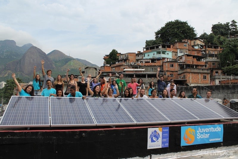 Zoom Im Vorfeld der FIFA-Fussball-WM in Brasilien hat ein Team von Greenpeace-Freiwilligen Mitte Juni ein Community Center mit angeschlossener Fussballhalle in einer Favela von Rio de Janeiro mit Solar Panels…