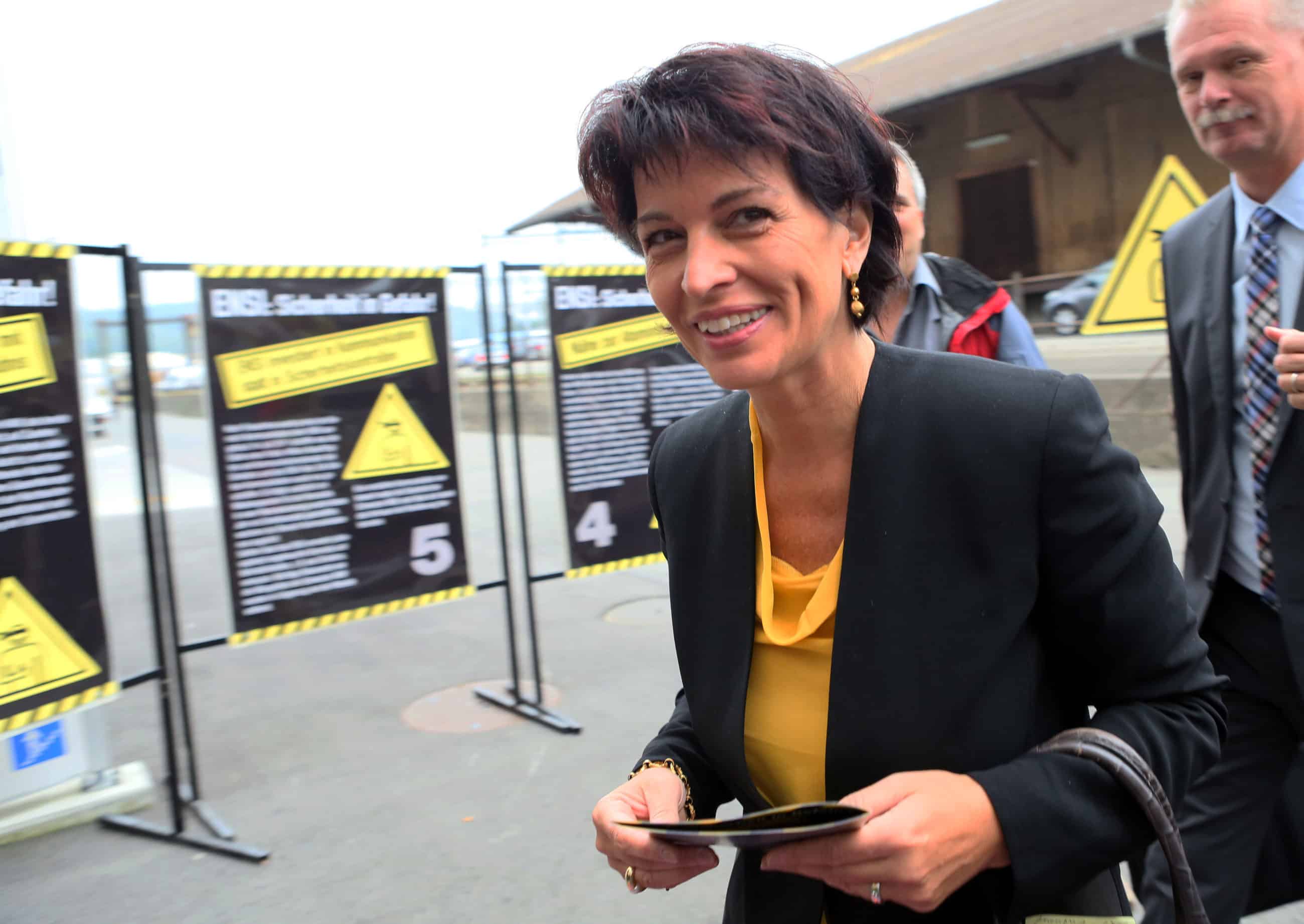 Dienstag, 4. September 2012 BR Leuthard vor den Plakaten der ENSI Kritiker. © Greenpeace, SES, WWF, NWA, sortir du nucleaire Eine „Talkshow“ nannten Greenpeace, WWF, SES, NWA und „Sortir du…