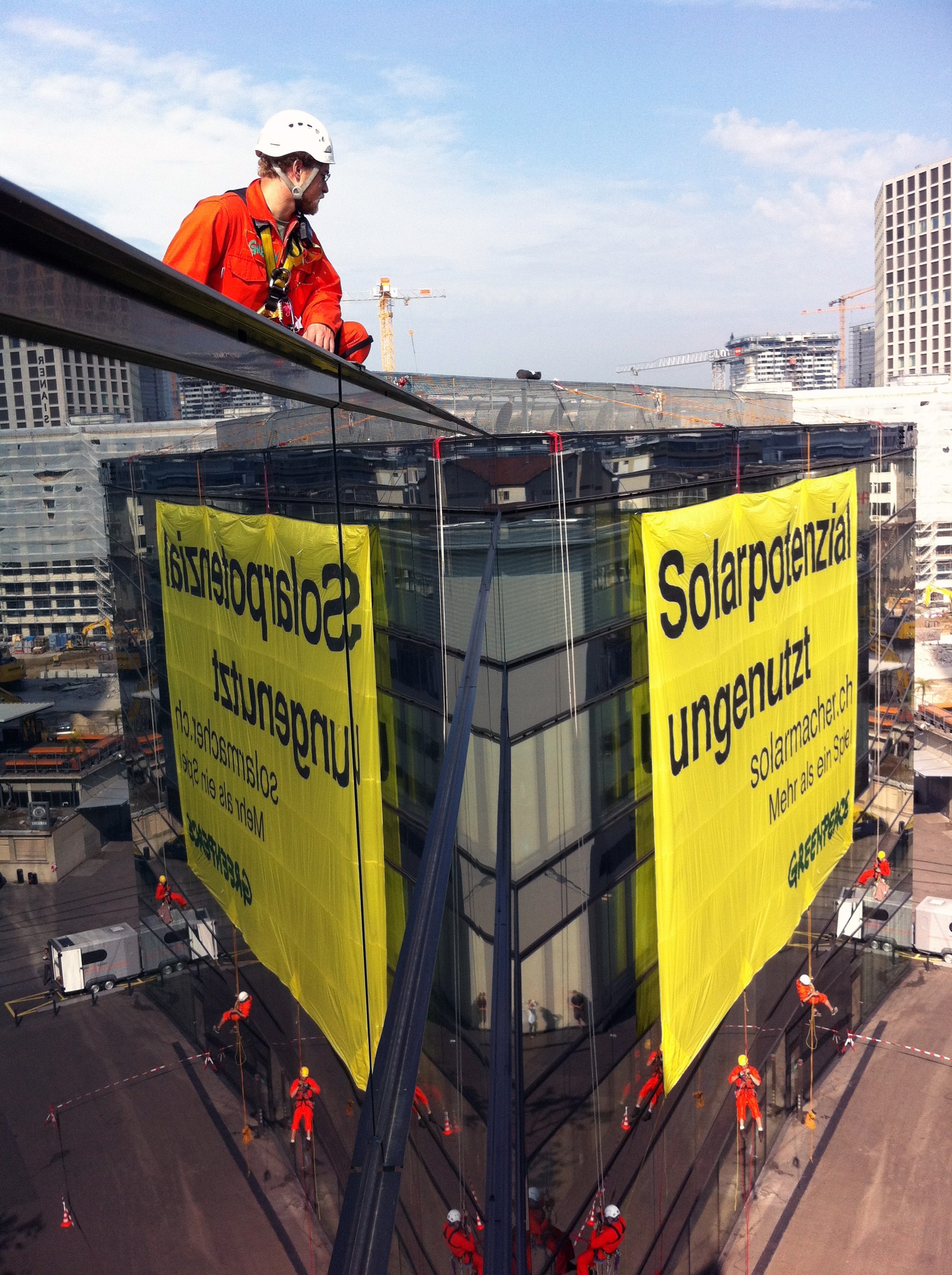 Auf den Dächern der Schweiz schlummert ein riesiges Strom-Potenzial. Bis dato ungenutzt! Heute Morgen machen Greenpeace-Aktivisten auf diesen Missstand aufmerksam und sind auf ein Gebäude im boomenden Zürich West geklettert.…