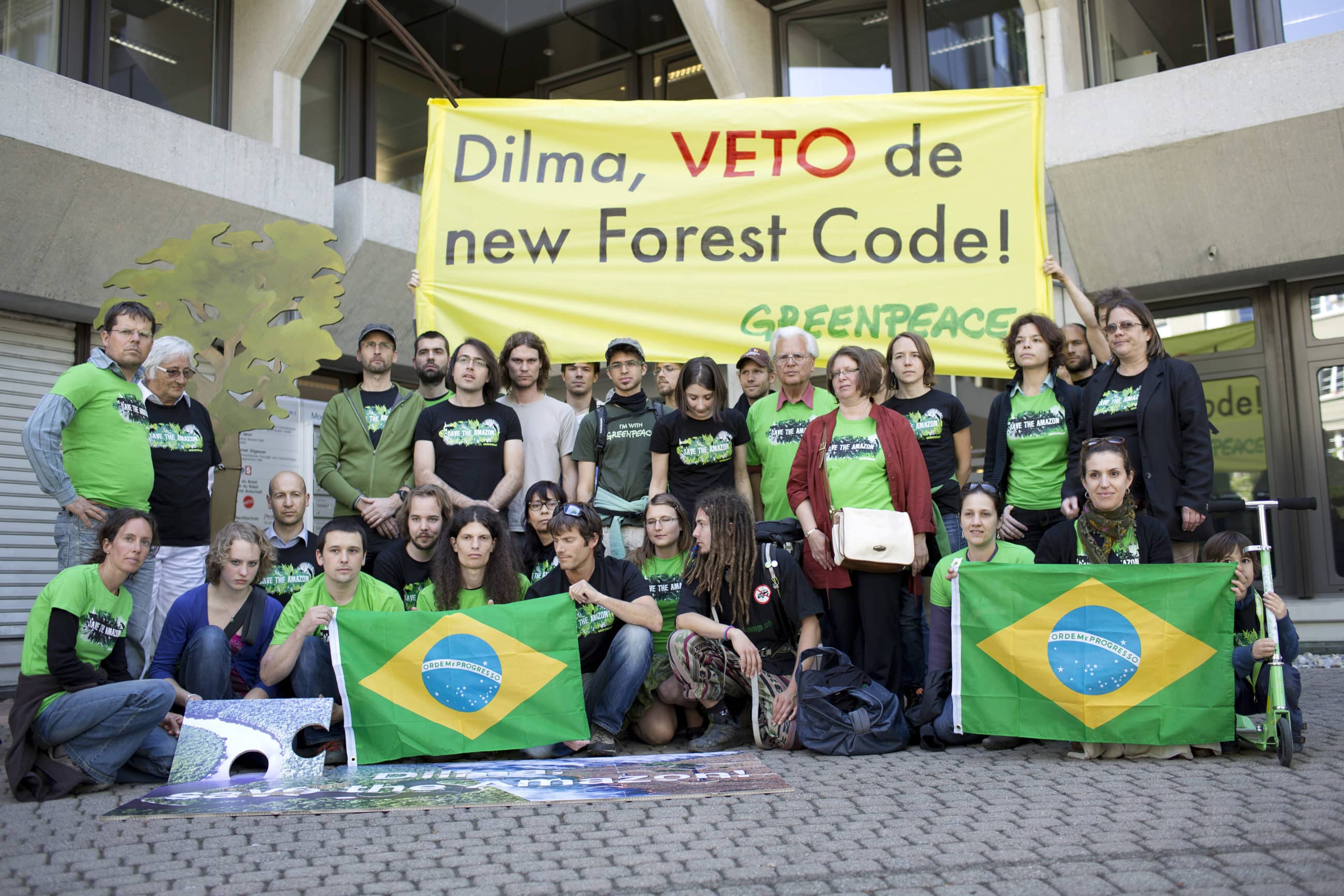 Dienstag, 15. Mai 2012 Greenpeace-Kampagne “Save The Amazon” in Bern vor der brasilianischen Botschaft am Montag (14.05.2012). Foto: Heike Grasser © Greenpeace/ Heike Grasser Mit einer Protestaktion bei der brasilianischen…