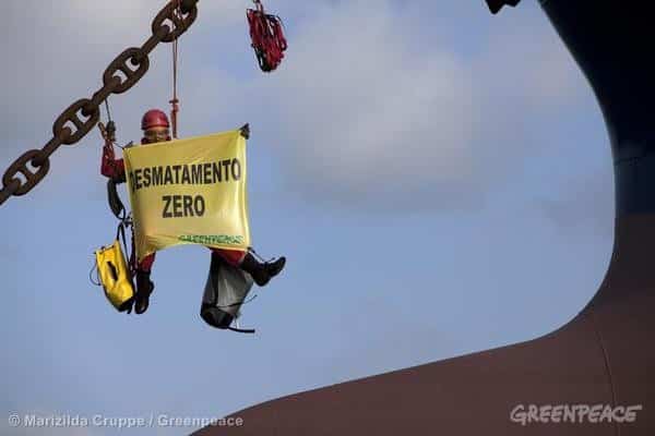 © Greenpeace/ Marizilda Cruppe Der Protest der Greenpeace-Aktivisten im Hafen von Sao Luis, Brasilien, dauert an. Seit Montag wechseln sich Kletterer auf der Ankerkette des Frachters Clipper Hope ab. Sie…