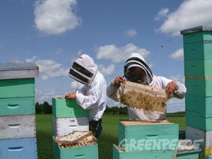 Bienen kennen keine Grenzen. Sie haben einen Sammel-Radius von mehreren Kilometern und transportieren auch Pollen von Gentech-Pflanzen über weite Distanzen. Imkerinnen und Imker sowie Greenpeace haben heute beim Pier 7…