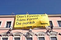Greenpeace-AktivstInnen aus sechs Ländern haben vor dem Büro des finnischen Waldministers Holz aus dem Urwald Lapplands abgeladen. © Greenpeace Helsinki. Das Holz war nach den Kahlschlag-Aktivitäten des staatlichen Holzkonzerns Metsähallitus…
