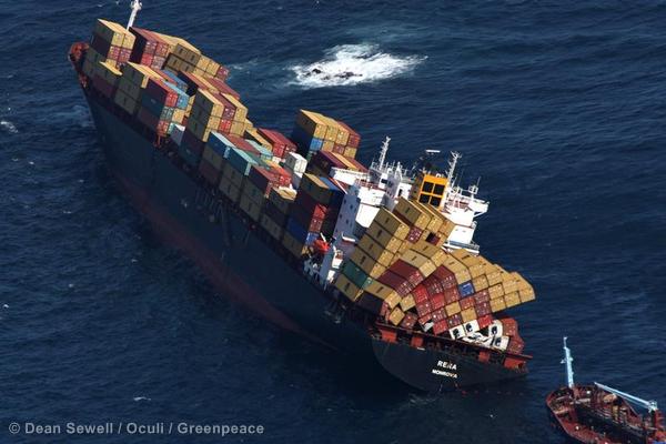 Der aufgelaufene Frachter Rena drohte auseinanderzubrechen. 10/21/2011 © Dean Sewell / Oculi / Greenpeace 1700 Tonnen Schweröl, Container mit hochgiftiger Alkylsulfonsäure, grosse Risse im Schiffsrumpf und stürmisches Seewetter: Lange…