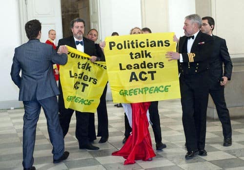 Die drei Greenpeace Aktivisten platzten am 19. Dezember 2009 ins königliche Dinner und protestierten für ein wirksames Klimaschutzabkommen. © AFP PHOTO/Jens Norgaard/Scanpix 2009 Kopenhagen/Zürich, 22.8.2011. Heute – gut eineinhalb Jahre…