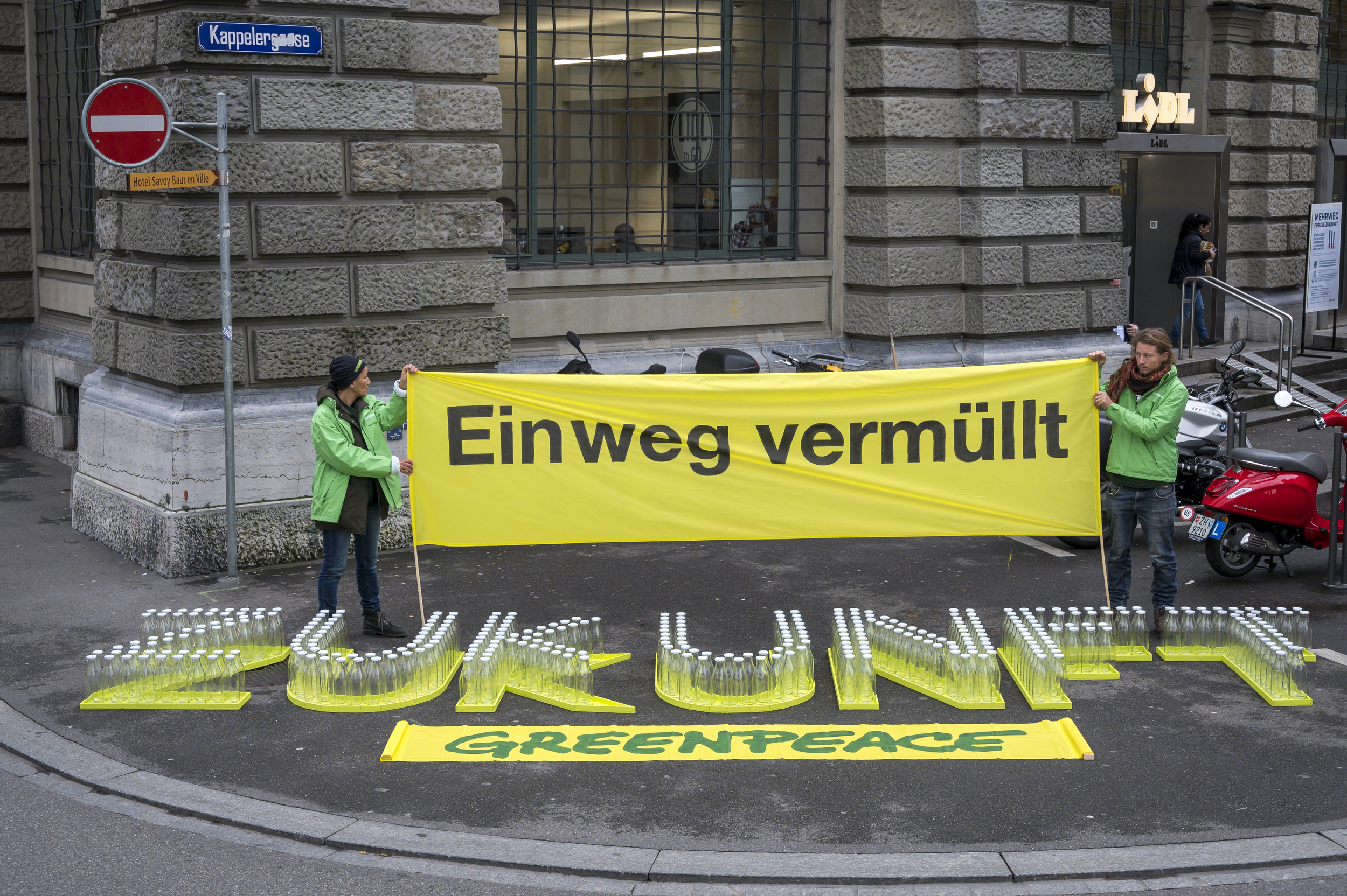 Schweizer Detailhändler könnten im Kampf gegen die Plastikkrise eine wichtige Rolle spielen. Doch noch wollen u.a. die Konzerne Aldi und Lidl ihre Verantwortung in der Reduktion von Einwegprodukten nicht wahrnehmen. Deshalb setzen sich Greenpeace-Aktivistinnen und -Aktivisten an diesem Mittwoch für eine Mehrwegrevolution ein.