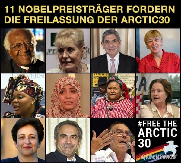 Elf TrägerInnen des Friedensnobelpreises – unter ihnen Erzbischof Desmond Tutu – haben in einem Brief an den russischen Präsidenten, Wladimir Putin, ihre Unterstützung für die «Arctic 30» zum Ausdruck gebracht.…