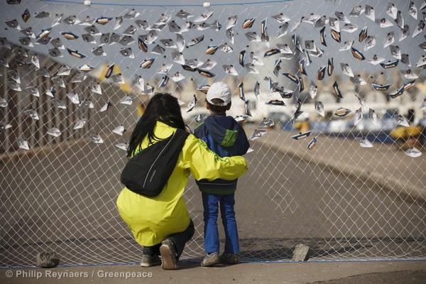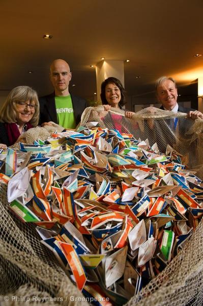 Gefaltete Papierschiffe im Netz als Symbol für ein Umdenken weg von industrieller Überfischung hin zu einer nachhaltigen Fischerei! © Philip Reynaers / Greenpeace Das letzte selbst gefaltete Papierschiff an das…